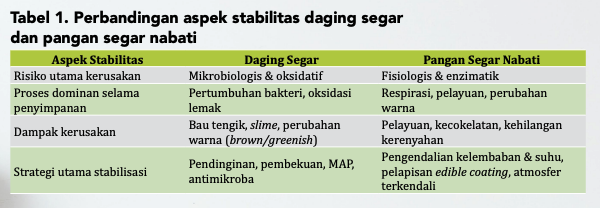 Stabilitas pangan segar yang dimaksud adalah kemampuan pangan segar tersebut mempertahankan mutu fisik, kimia dan zat gizi serta sensoris selama penyimpanan dan distribusi. Sifat biologis dan komposisi kimia yang berbeda antara pangan segar hewani dan nabati sangat menentukan stabilitasnya (Tabel 1). Ditinjau dari komposisi kimianya, daging segar memiliki kadar air yang tinggi (65- 75%), kaya protein, lemak dan zat gizi yang mudah tercerna. Kondisi tersebut menyebabkan daging rentan terhadap pertumbuhan mikroorganisme pembusuk dan patogen seperti Salmonella, Listeria monocytogenes dan Escherichia coli. Selain itu, keberadaan lemak menjadikan rentan terhadap proses oksidasi yang dapat terlihat dari perubahan warna daging, bau dan aroma tidak sedap. Proses proteolitik enzimatis maupun mikrobiologis dapat mempercepat degradasi protein yang menyebabkan kemampuan protein daging untuk mengikat air menurun,