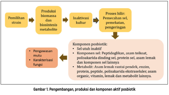 Tahapan proses ini diawali dengan seleksi strain mikroorganisme yang menghasilkan metabolit yang memiliki manfaat kesehatan (Gambar 1). Produksi probiotik sangat tergantung pada jenis mikroorganisme dan target senyawa bioaktif yang diproduksi, sehingga jenis substrat yang digunakan akan mempengaruhi bioaktivitasnya. Sebagai contoh posbiotik kaya akan asam lemak rantai pendek diproduksi dengan substrat prebiotik seperti fructooligosakarida, sedangkan posbiotik kaya akan asam teikoat diproduksi dari bakteri Gram positif yang diikuti dengan proses sonikasi dan posbiotik berbasis polisakarida diproduksi dengan menggunakan bakteri produsen polisakarida ekstraseluler pada media kaya gula (Meena et al. 2025).