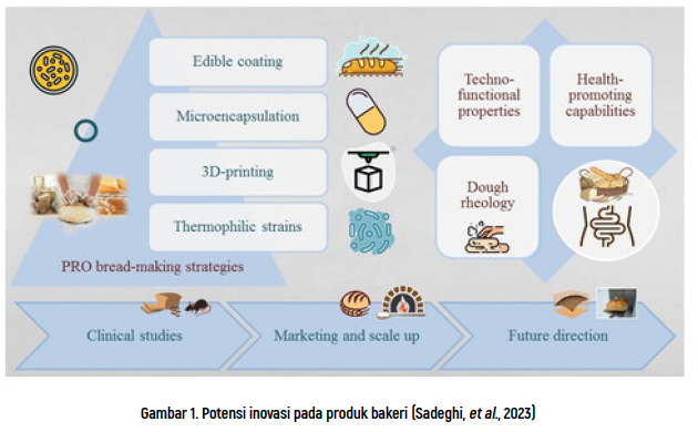 Hingga saat ini, ada beberapa inovasi pada produk bakeri diantaranya yaitu: 1) inovasi dengan pelapisan adonan 38 pada tahap proofing; 2) inovasi dengan teknologi mikroenkapsulasi ingridien tambahan; 3) inovasi dengan pencetakan tiga dimensi/karakter; inovasi dengan pemilihan ragi tahan suhu tinggi; 4) inovasi dengan aplikasi ingridien fungsional, prebiotik, antioksidan, probiotik, dan lainnya. Inovasi dengan aplikasi ingridien fungsional untuk kesehatan harus telah melalui uji klinis bagi hal manfaat dan modus aksi fungsional kesehatan maupun retensi ingridien fungsional tersebut pada produk akhir bakeri. Tidak kalah penting adalah scale up produksi serta pemasarannya ketika disertai klaim baik fungsional teknis maupun fungsional kesehatan (Sadeghi et al., 2023).