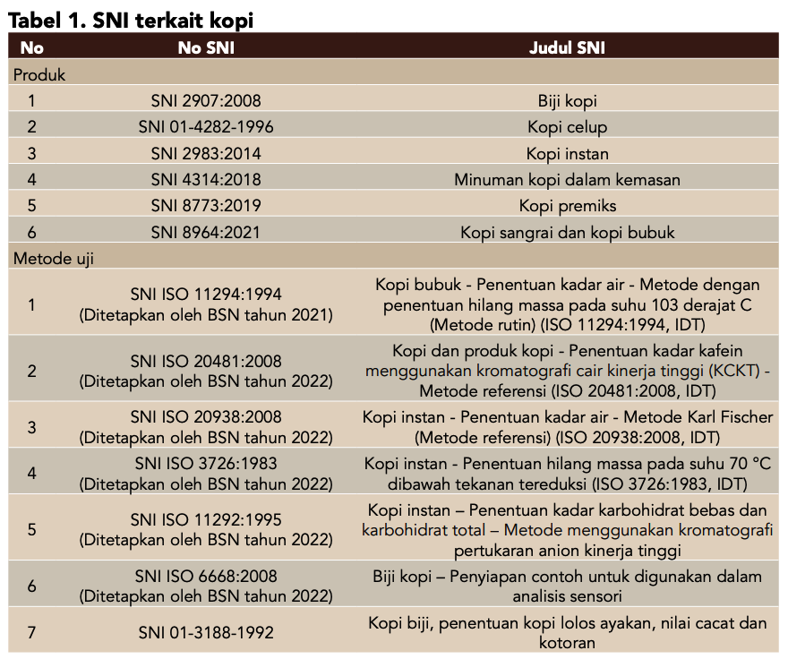 Untuk memastikan kopi yang kita konsumsi bermutu dan aman, tentu diperlukan standar yang dapat dijadikan acuan dalam memproduksi kopi mulai dari hulu hingga siap dikonsumsi. Menurut UU Nomor 20 Tahun 2014, standar adalah persyaratan teknis atau sesuatu yang dibakukan, termasuk tata cara dan metode yang disusun berdasarkan konsensus semua pihak/pemerintah/keputusan internasional yang terkait dengan memperhatikan syarat keselamatan, keamanan, kesehatan, lingkungan hidup, perkembangan ilmu pengetahuan dan teknologi, pengalaman, serta perkembangan masa kini dan masa depan untuk memperoleh manfaat yang sebesar-besarnya. Sesuai tugas dan fungsi Badan Standardisasi Nasional (BSN) selaku pembina standardisasi dan penilaian kesesuaian, BSN menetapkan Standar Nasional Indonesia (SNI) yang menjadi acuan bagi pelaku usaha untuk meningkatkan jaminan mutu, efisiensi produksi, daya saing nasional, persaingan usaha yang sehat dan transparan dalam perdagangan. Beberapa SNI terkait kopi yang telah ditetapkan baik untuk produk segar dan olahan dapat dilihat pada Tabel 1. Di samping itu, untuk mendukung pembuktian terhadap suatu parameter produk, BSN juga menetapan SNI-SNI terkait metode uji kopi yang dapat dijadikan acuan bagi laboratorium dalam memeriksa kesesuaian produk dengan standar acuan.