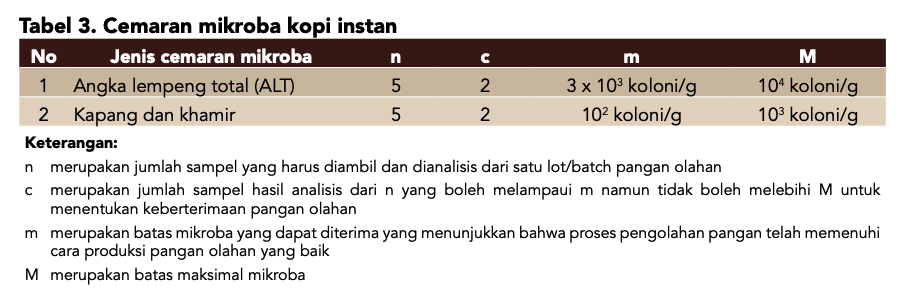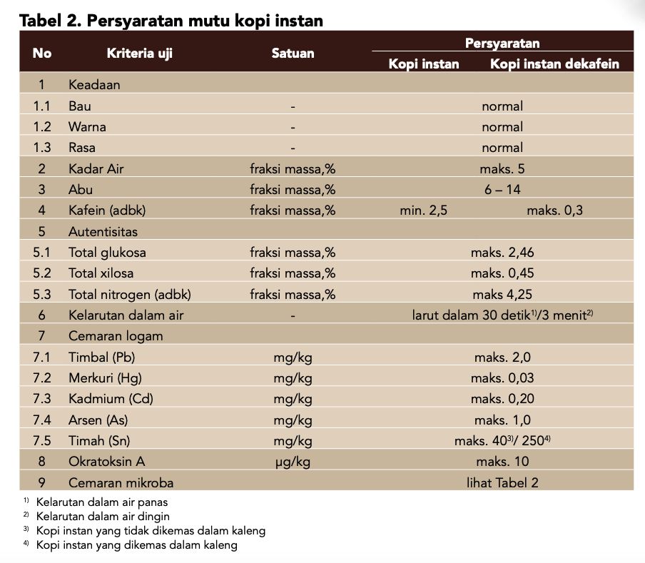 Lebih lanjut, selain adanya penyesuaian dari definisi produk, cara uji dan syarat mutu yang telah ada sebelumnya, dalam upaya mencegah adanya pemalsuan atau adulterasi dalam produk kopi instan, pada revisi ini juga ditambahkan satu syarat mutu pada kriteria autentisitas. Sebelumnya, kriteria autentisitas hanya mengukur total glukosa dan total xilosa, kini pada kriteria autentisitas juga ditetapkan syarat mutu total nitrogen. Hal ini bertujuan untuk memastikan bahwa tidak ada penambahan bahan pangan lain non-kopi pada produk kopi instan yang dihasilkan. Persyaratan mutu kopi instan yang ditetapkan dalam SNI 2983:2024 bertujuan untuk memastikan keamanan pangan, kualitas rasa dan aroma serta kandungan kafein kopi instan. Persyaratan mutu kopi instan ditampilkan pada Tabel 2 dan cemaran mikroba ditampilkan pada Tabel 3.