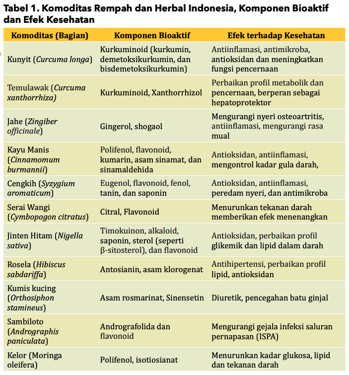 Keunikan dari komoditas rempah dan herbal Indonesia adalah keragaman senyawa bioaktifnya dengan mekanisme kerja yang saling melengkapi. Sebagai contoh gingerol pada jahe terbukti mendukung kesehatan lambung dan mengurangi rasa mual, sementara antosianin pada rosela efektif membantu menurunkan tekanan darah. Variasi komponen bioaktif ini memberikan peluang luas bagi pengembangan produk pangan fungsional yang tidak hanya menonjolkan satu manfaat, tetapi juga menggabungkan efek sinergis untuk kesehatan secara menyeluruh.